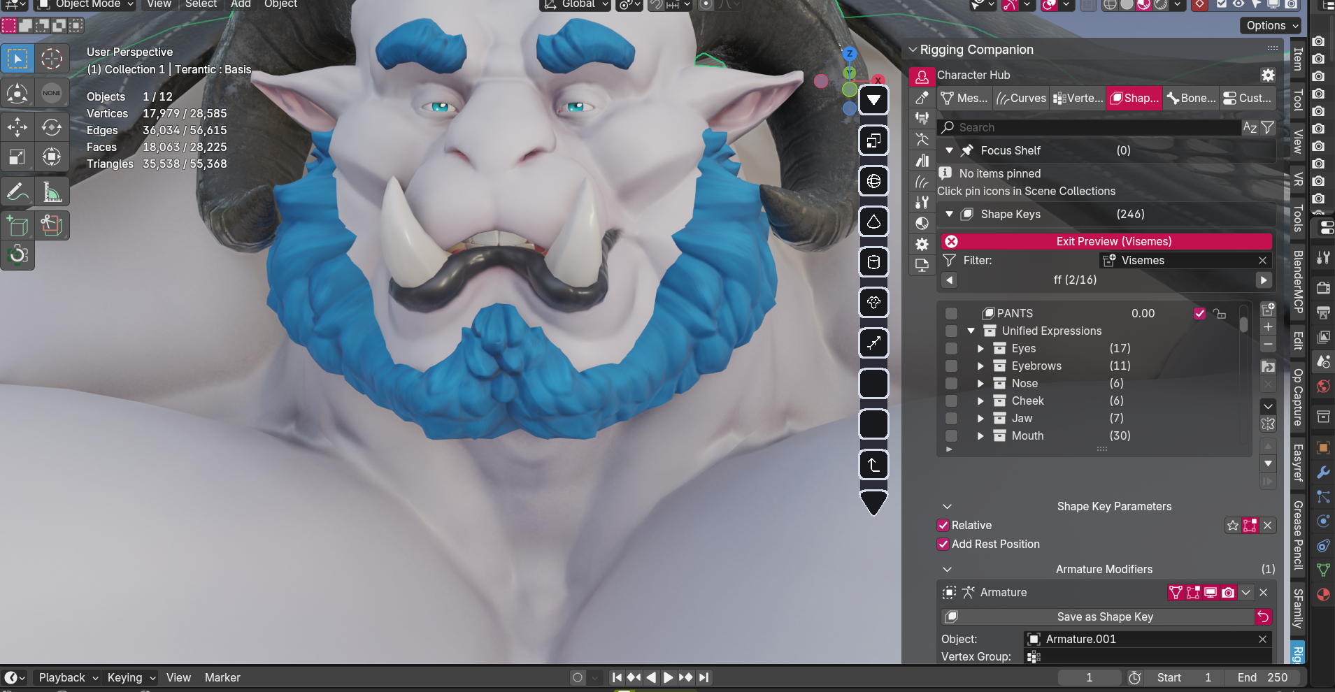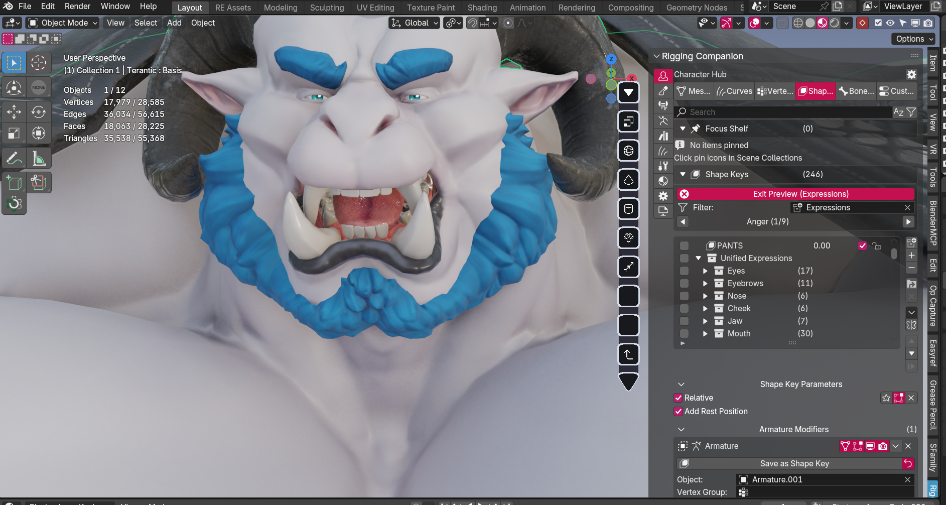 I create shape keys (blendshapes) that morph your character's mesh. These are used for facial expressions, corrective deformations, and special effects.