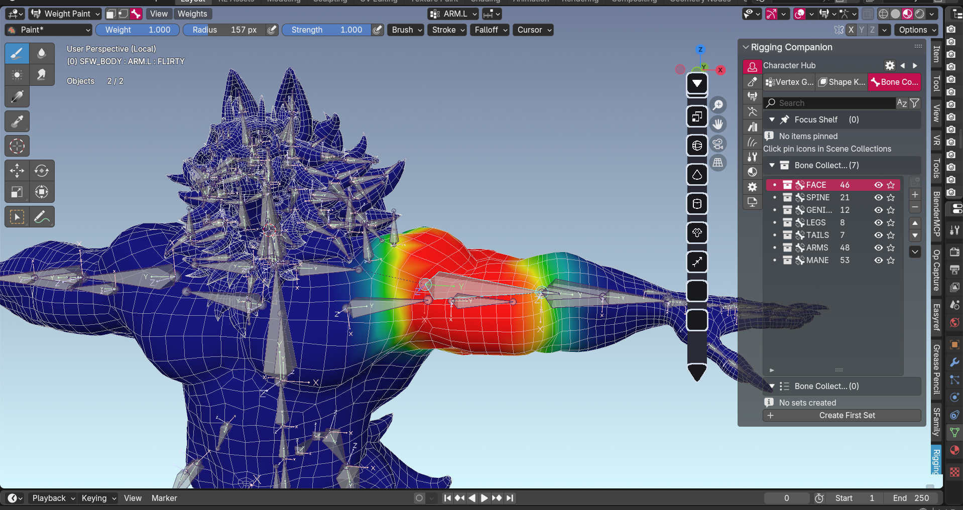 I manually paint how much each bone affects each part of the mesh. This is what makes shoulders deform correctly, prevents the elbow from collapsing, and ensures muscles flex naturally. Done by hand for precision control.